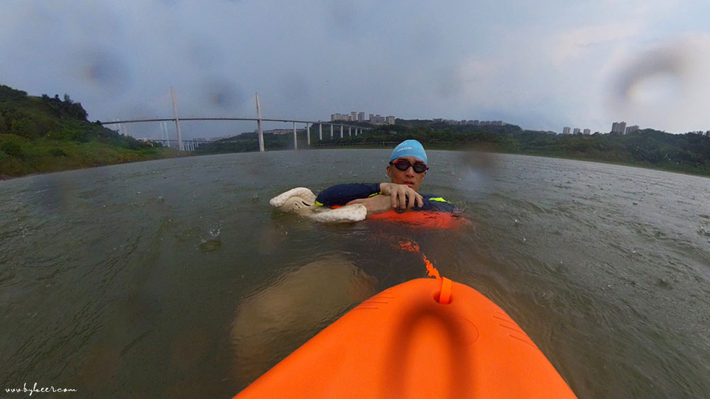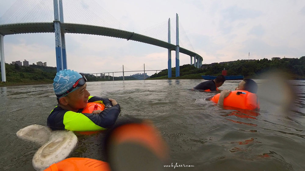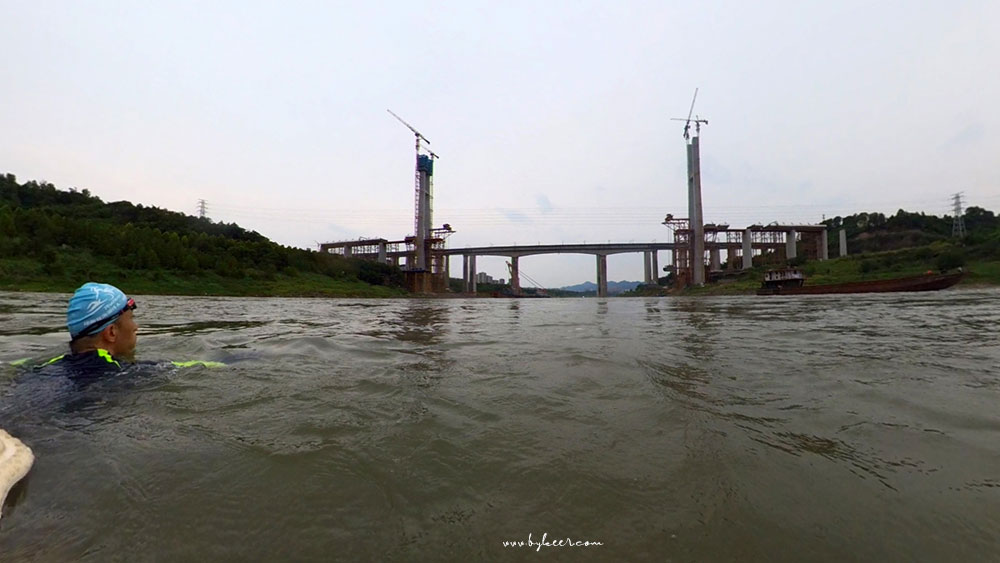 嘉陵江水澄碧、温润、渺无际涯。接连穿过三座大桥:地铁6号线跨江桥,蔡家公路大桥,马鞍石大桥。泡在江中,两岸景色无甚变化,似乎速度滞缓;但这只是因为离岸太远的错觉,实则轻盈迅捷,特别是找到并汇入了江水主流,在那种速度下几乎无法挂靠上航标船:不单游泳难以接近,有时即便距离很近了,也会在刹那间倏忽滑过。不知漂游了多久,看不见后面的熊和石峰,岸边出现一片礁石,费了些劲终于靠过去。一看表,出发正好一个小时,已经漂出7公里开外。颇为惊讶。